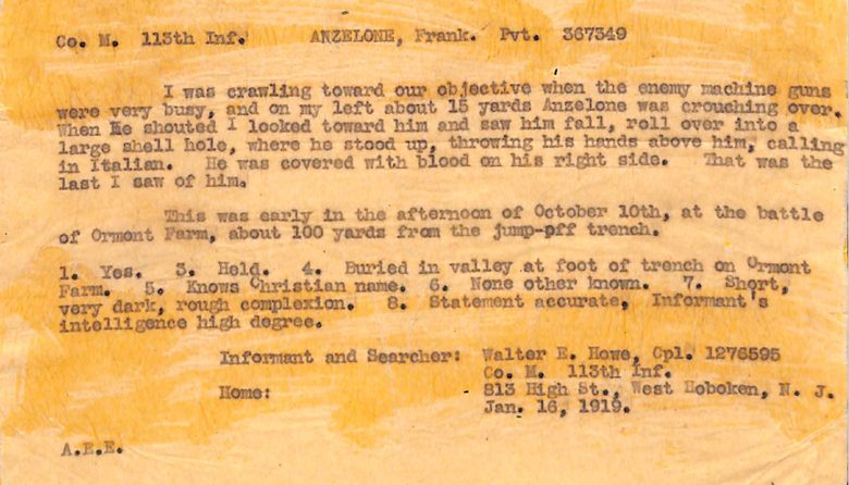 La breve esperienza militare di Francesco ebbe inizio il primo maggio 1918 a Fort Slocum, nello stato di New York, divenuto uno dei principali centri di reclutamento del Paese dopo l’ingresso in guerra degli Stati Uniti, e proseguì, dopo le visite mediche, con l’inquadramento nella compagnia M del 113° Reggimento di Fanteria, parte della 29ª Divisione, che lo condusse a Camp McClellan, in Alabama, per una prima fase di addestramento.