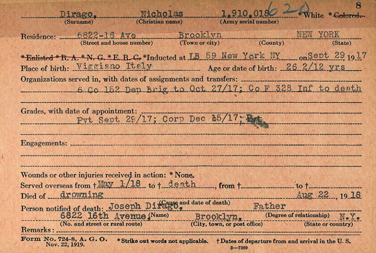 L’addestramento per il 328° proseguì in America fino al primo maggio del 1918, giorno dell’imbarco a Boston: Nicolò ed il secondo battaglione salirono a bordo del piroscafo Scandinavian che, unitosi ad un nutrito convoglio che comprendeva anche parte del contingente canadase, trasportò le truppe a Liverpool in poco più di una settimana.